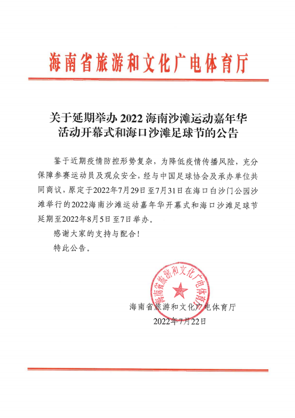 关于延期举办2022海南沙滩运动嘉年华活动开幕式和海口沙滩足球节的公告