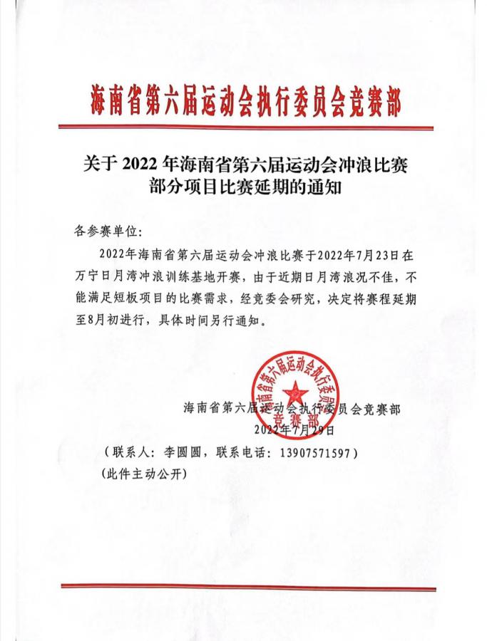 关于海南省第六届运动会冲浪比赛部分项目比赛延期的通知